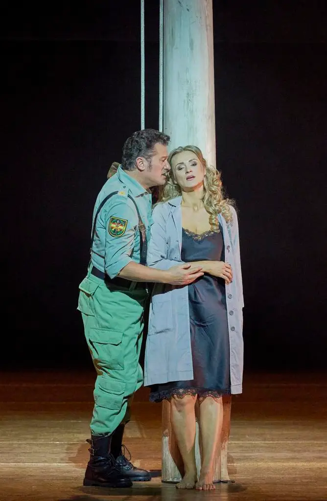 Brutalität, Nacktheit und Sexualität dominieren in der Inszenierung von Calixto Bieito, die seit 2021 auch im Haus am Ring gezeigt wird. Aber genau diese Themen in einer von Gewalt geprägten Gesellschaft sind die Essenz des Stückes. Aufständische Fabriksarbeiterinnen, johlende Soldaten, ausgegrenzte Roma bleiben nicht ausgespart. Am stärksten ist die Inszenierung, wenn sich die ProtagonistInnen allein gegenüberstehen: Bieito überzeugt mit seiner drastischen Personenführung, seiner abgründigen Personenregie. Neben alten Limousinen der Schmuggler dominiert ein riesiger hölzerner Stier die Bühne. Die Beziehung zwischen dem Torero und dem Stier im Stierkampf entspricht der Beziehung zwischen Mann und Frau in großen Teilen der spanischen Gesellschaft. In seiner „Ehre“ – welche die Hierarchie von Mann und Frau in Spanien prägt – gekränkt, meuchelt Don Josè schließlich Carmen vor der Arena, worin auch der Stierkampf tobt: selten hat das jemand so zwingend umgesetzt wie Bieito mit seiner beinahe überdeutlichen Szenerie.