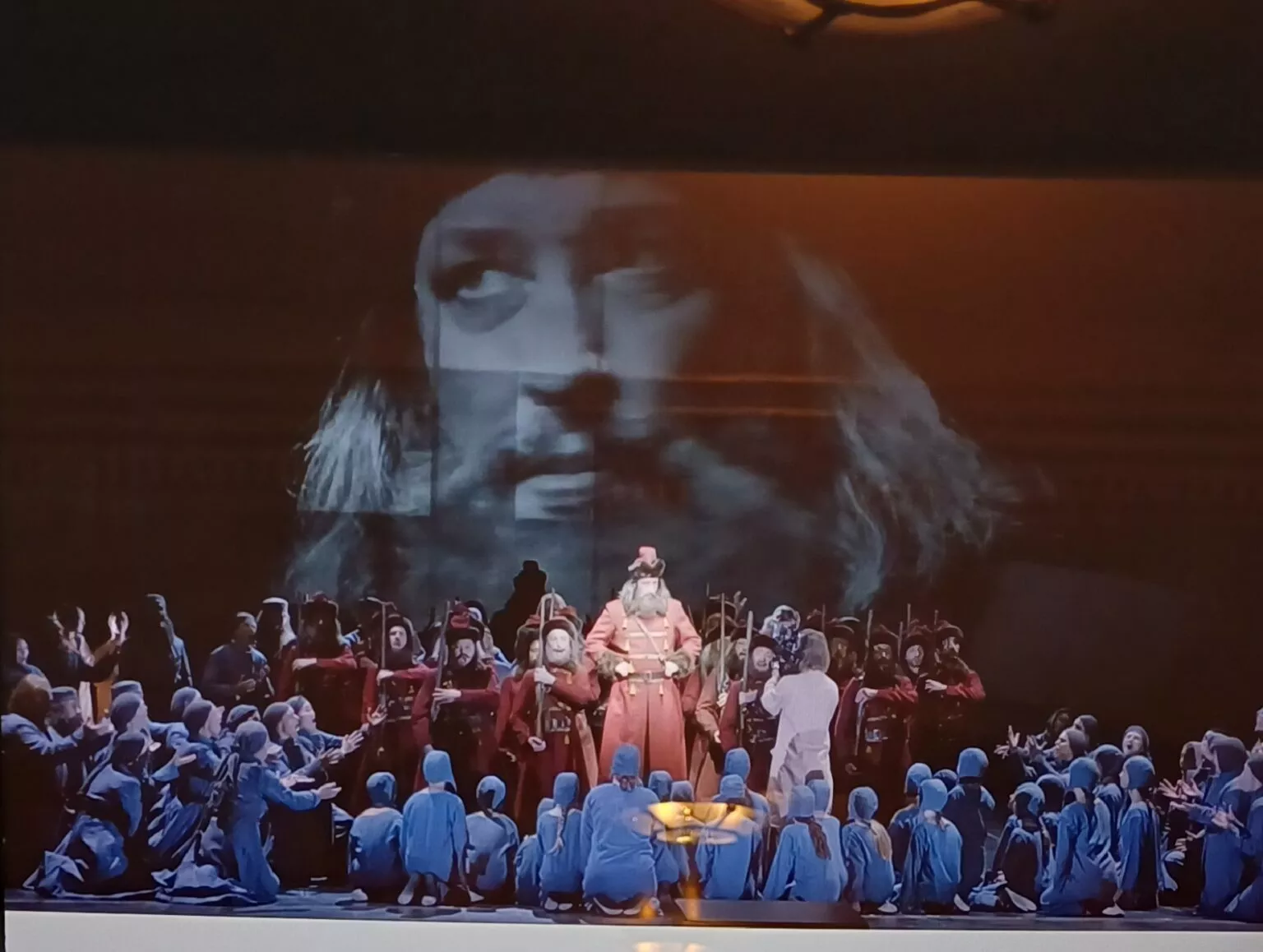 Regisseur Claus Guth stellt dieses Volk auch in das Zentrum seiner Inszenierung, sind die Protagonist:innen von Personenregie wie Personenführung nicht so stark charakterisiert, wie sonst üblich. Dominierend auf der Bühne sind immer die Menschenmassen, einzelne Handlungsträger:innen werden durch gekonnte Videos (Roland Horvath) und dem zwingenden Einsatz von Live-Kameras (Jan Speckenbach, Marlene Blumert) immer wieder hervorgehoben. Anders als von ihm gewohnt, nähert sich Guth den Protagonist:innen in dieser Regiearbeit nicht mit seiner üblichen psychologischen Präzision, setzt sogar Szenen in historischen Kostümen und Bühnenbildern (Ursula Kudrna, Christian Schmidt) nahezu werktreu in Szene, aktualisiert wird zusätzlich mit Hilfe der bereits erwähnten Videos. Seine Inszenierung arbeitet mit zwei Zeitebenen – die historische um die Geschehnisse in Russland im ausgehenden 17. Jahrhundert, die modern aktuelle mit den Forscher:innen und Archivar:innen, welche die Szene ergänzen, indem sie herausfinden wollen, warum es einer Herrscherfigur wie Zar Peter I., den Großen, in Russland bedurfte, um Ordnung in das Chaos im Land zu bringen. Entstanden ist so ein Geschichtsdiskurs: Zar Peter I. erscheint immer wieder in der Szene – als Hoffnungsträger zur Beendigung der Machtkämpfe zwischen aufrührerischen Strelitzen, machtbesessenen Bojaren und konservativen Kirchenkreisen auf Kosten des gepeinigten, leidenden Volkes? Und dabei lässt auch die aktuelle russische Gegenwart grüßen: Claus Guths Inszenierung überzeugt stark in ihrer Vielschichtigkeit.