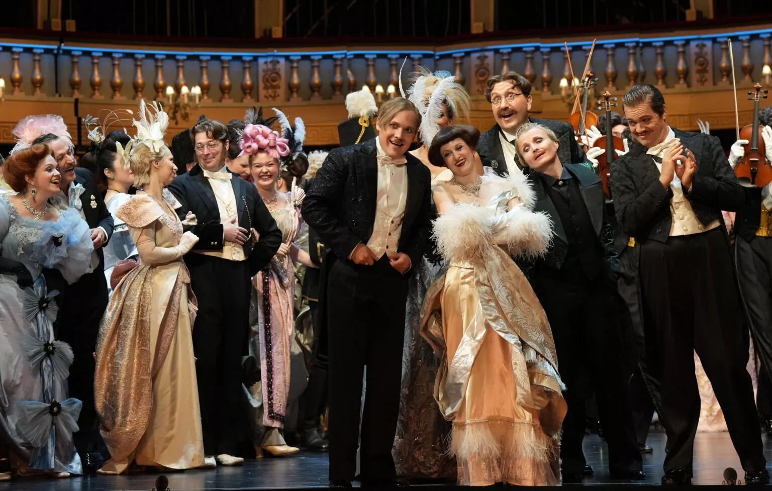 In musikalischer Hinsicht ist diese Premiere jedenfalls sehr gelungen. Petr Popelka bleibt, von den Einschüben abgesehen, der Partitur, so wie sie Strauss geschrieben hat, treu. Die Wiener Symphoniker spielen an diesem Premierenabend groß auf, mit überschäumender Musizierlust in Festtagslaune. Schwung, Drive, Zug dominieren diese Lesart, Popelka betont auch die wehmütige Melancholie der großartigen Musik, lässt aber auch die Champagnerkorken ordentlich knallen, das Stück verträgt’s, verlangt’s sogar. Gewohnt hervorragend, was Gesang und Darstellung betrifft, der Arnold Schoenberg Chor, die Choreinstudierung hat Viktor Mitrevski besorgt.